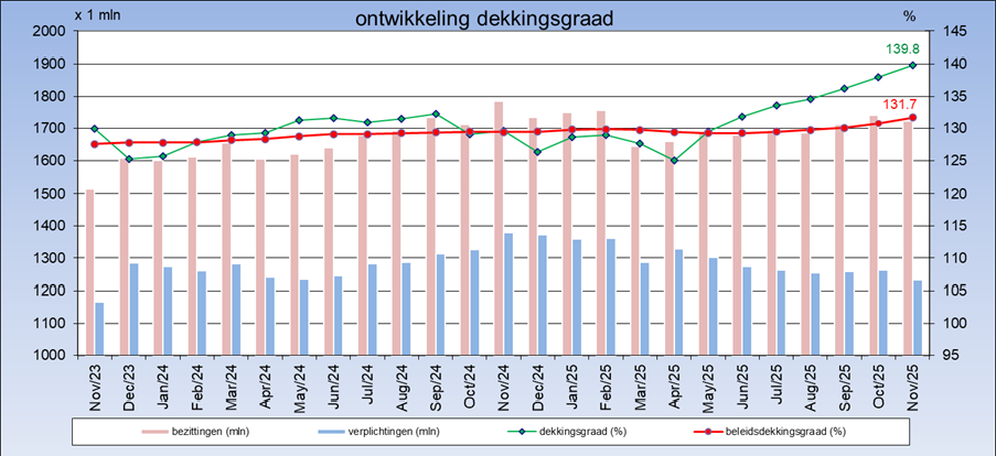 Hieronder ziet u het verloop van de bezittingen, de verplichtingen en de dekkingsgraad in de afgelopen twee jaar: